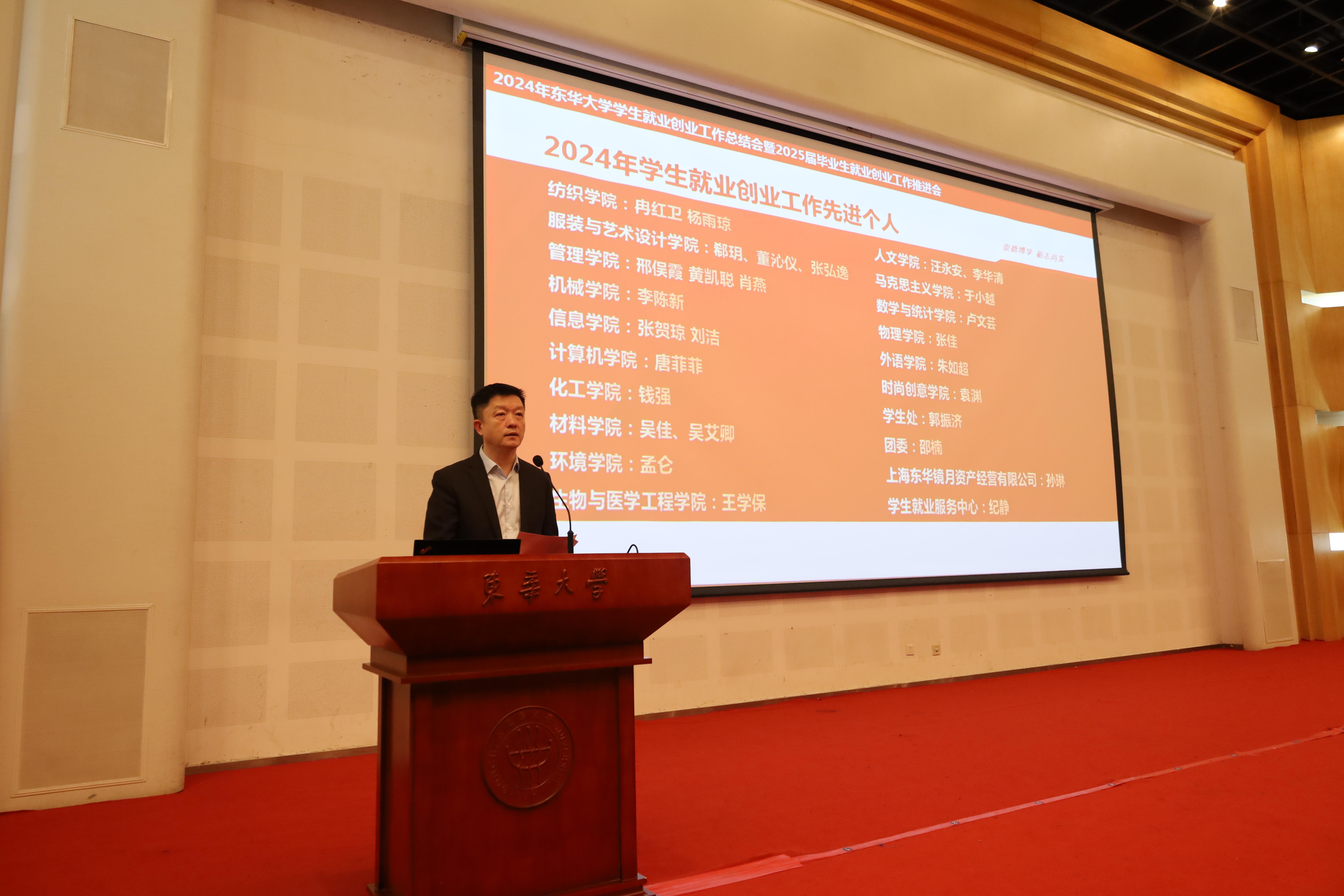 会上,陈革宣读东华大学2024年学生就业创业工作先进个人和学生就业创业工作促进奖获奖名单。