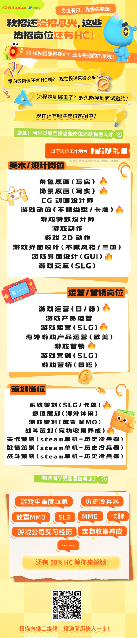 阿里灵犀互娱作为专注于精品游戏研发与发行的公司,招聘计算机科学、数字媒体艺术、设计学等领域的26届毕业生!